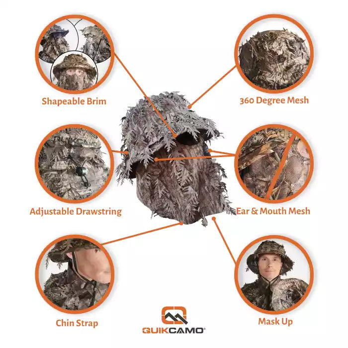 Stay concealed and comfortable in the woods with the QuikCamo 2-in-1 leafy camo hat with front face mask. Designed for hunters, wildlife photographers, and anyone who needs low-profile coverage, this...